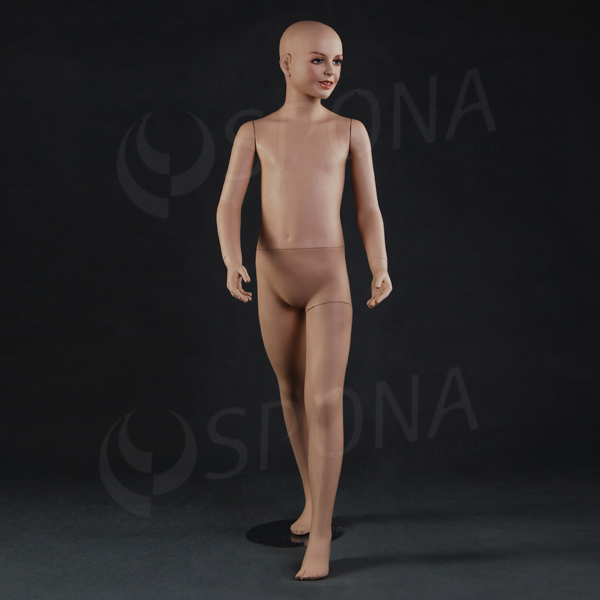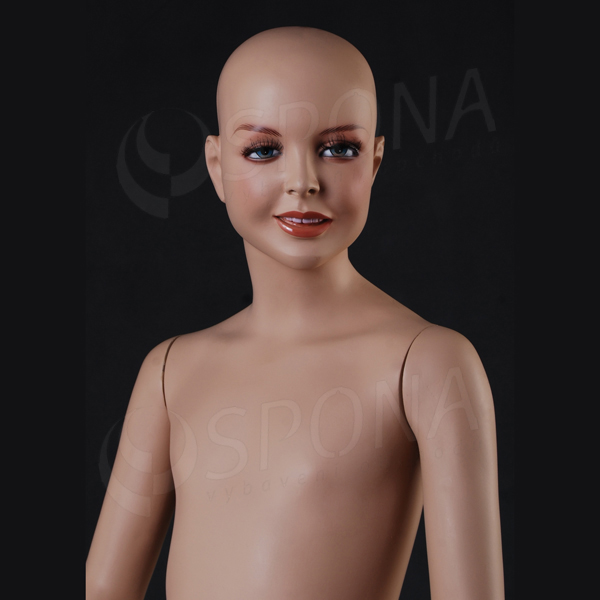 Kvalitní figurína malé dívky v tělové barvě bez paruky, včetně skleněného podstavce.