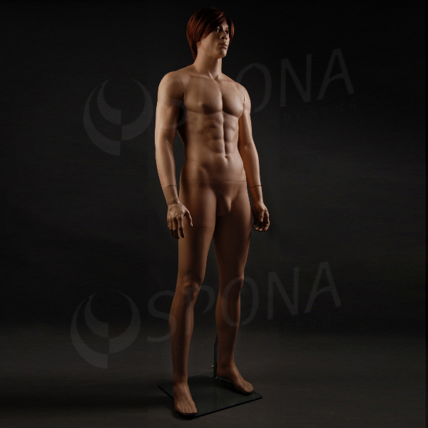 Stojící figurína urostlého muže v tělové barvě bez paruky včetně skleněného podstavce.